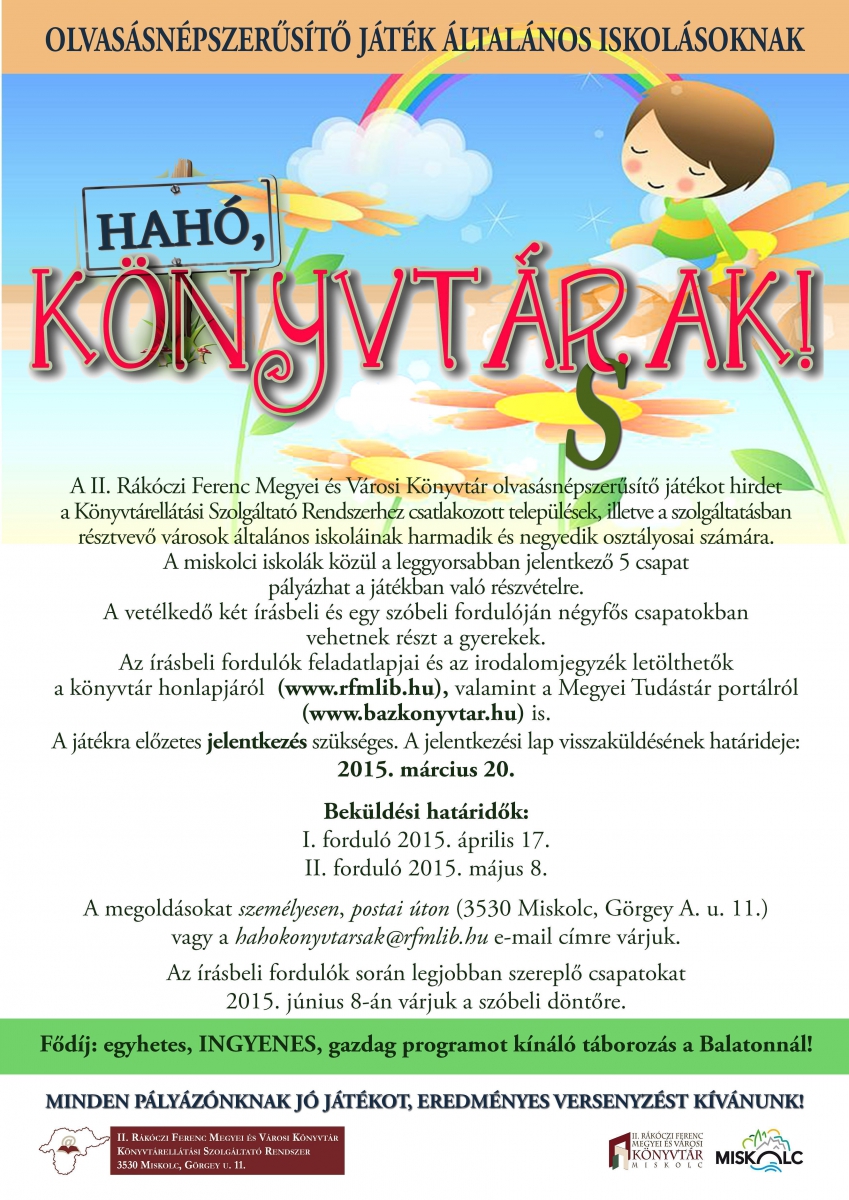 Hahó, könyvtár(s)ak! címmel olvasásnépszerűsítő játékot hirdet a II. Rákóczi Ferenc Megyei és Városi Könyvtár a Könyvtárellátási Szolgáltató Rendszerhez csatlakozott települések, illetve az ellátásban résztvevő városokban lévő általános iskolák harmadik és negyedik osztályosai számára. A miskolci iskolák közül a leggyorsabban jelentkező 5 csapat pályázhat a játékban való részvételre. A fődíj egyhetes, ingyenes, gazdag programot kínáló nyaralás a Balatonnál. A jelentkezési lapok visszaküldésének határideje: 2015. március 20. Az első forduló feladatlapjának beküldési határideje: 2015. április 17 volt. A második forduló beküldési határideje: május 8.