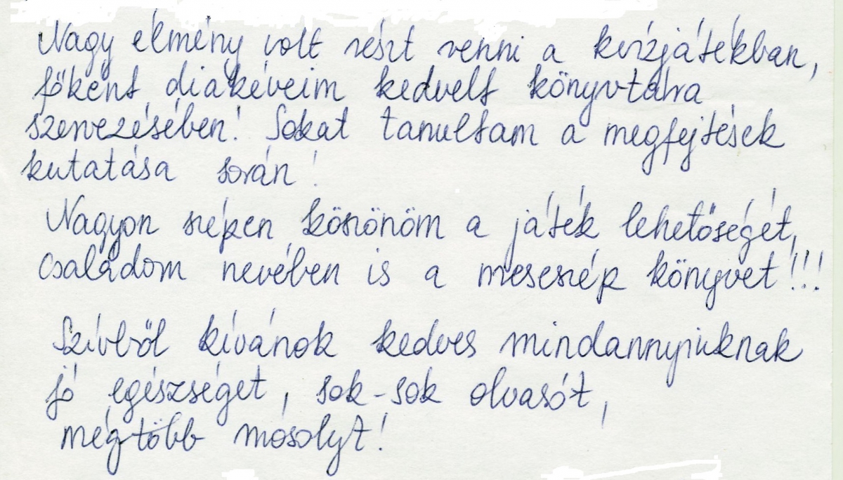 Nagy élmény volt részt venni a kvízjátékban, főként diákéveim kedvelt könyvtára szervezésében! Sokat tanultam a megfejtések kutatása során!