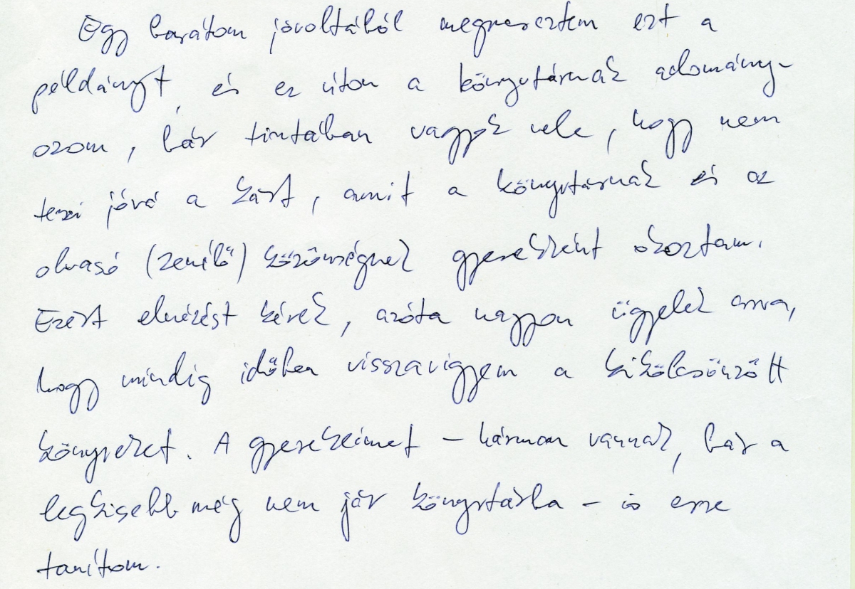 „Gyermekkoromban, még az 1900-as években kikölcsönöztem a könyvtárukból ennek a kottának egy példányát. Sajnos azóta sem vittem vissza, amiért több mint 20 éve furdal a lelkiismeret.