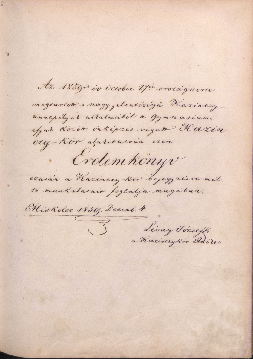 „Önérzet! Te vagy a győzőnek bére nem a díj.” Ezzel a mottóval kezdődik a miskolci református gimnázium Kazinczy Önképzőkörének érdemkönyve. 1859 októberében a Kazinczy Ferenc születésének 100. évfordulójára rendezett országos megemlékezés alkalmával Lévay József a miskolci református gimnázium akkori magyar tanára indítványozta, hogy „az ifjúság képzése czéljából az iskolában már a régibb időben fennállott önképző társulat elevenittessék fel és a halhatatlan érdemű nyelvújító emlékére »Kazinczy-önképzőkör«-nek neveztessék.”