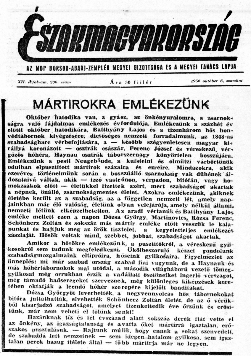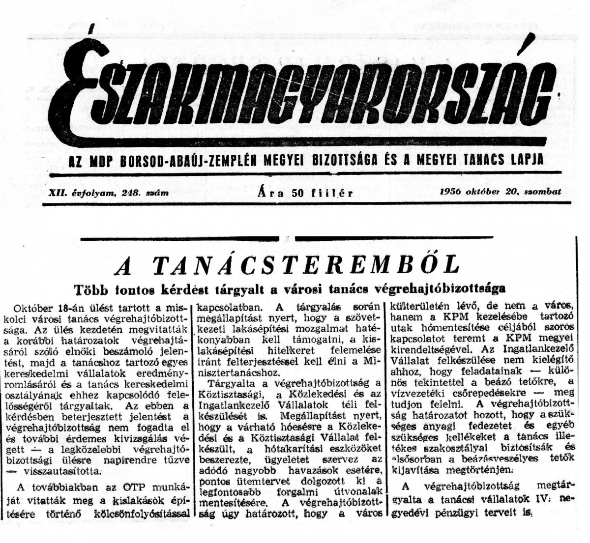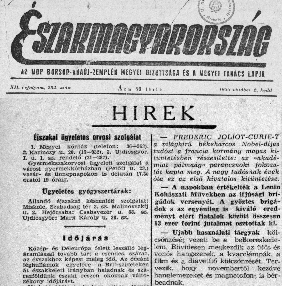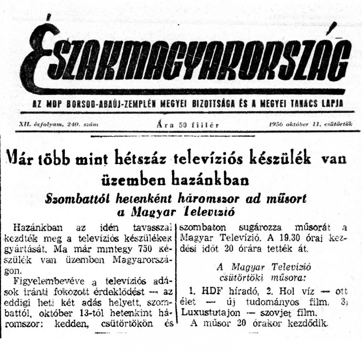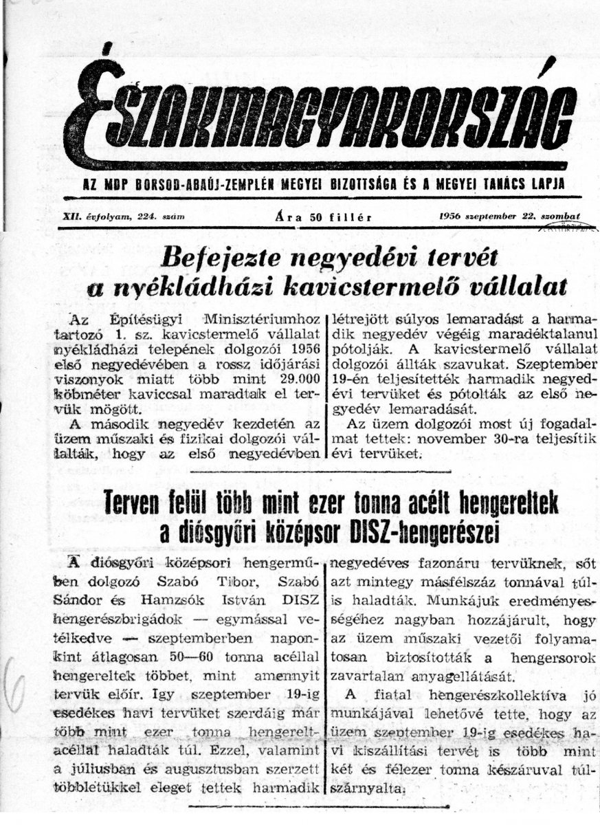 Vajon miről szóltak a hírek közvetlenül a forradalom előtt? Miről írt „az újság”, az Északmagyarország című napilap? Kiválasztottunk 56 hírt 1956-ról, minden napra egyet az október 23-ai forradalmat megelőző időkből – és mindig az adott napon tesszük közzé itt, honlapunkon. (Hétfőn nem jelent meg a lap, az akkori hétfőkre a vasárnapi lapból választottunk.) Kövessék velünk ennek a közel két hónapnak az eseményeit, olvassák velünk napról napra az 1956-os év 56 hírét!