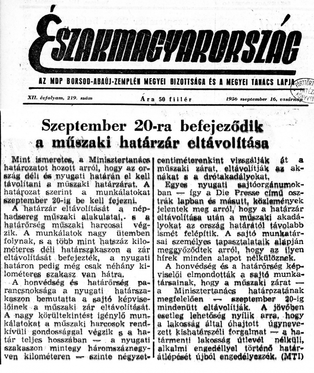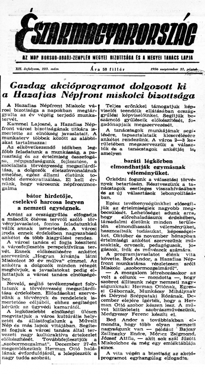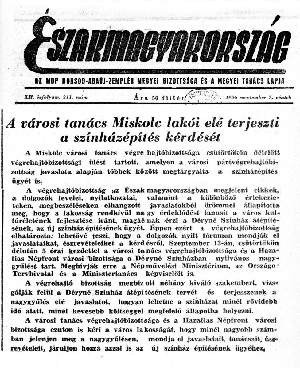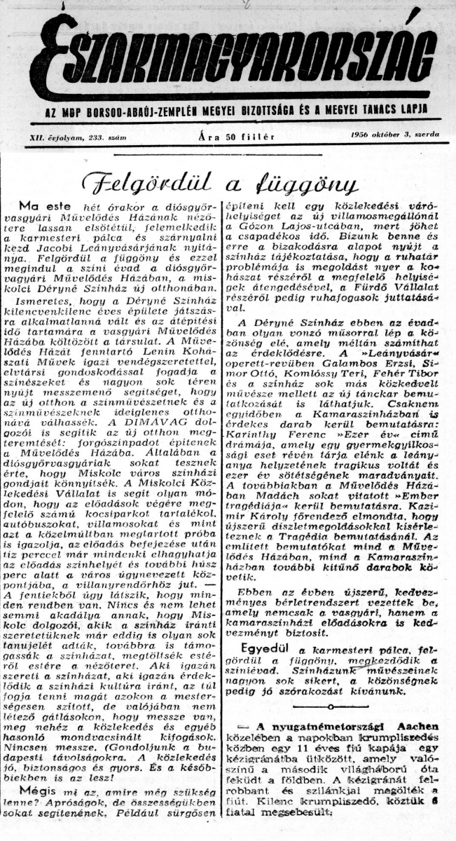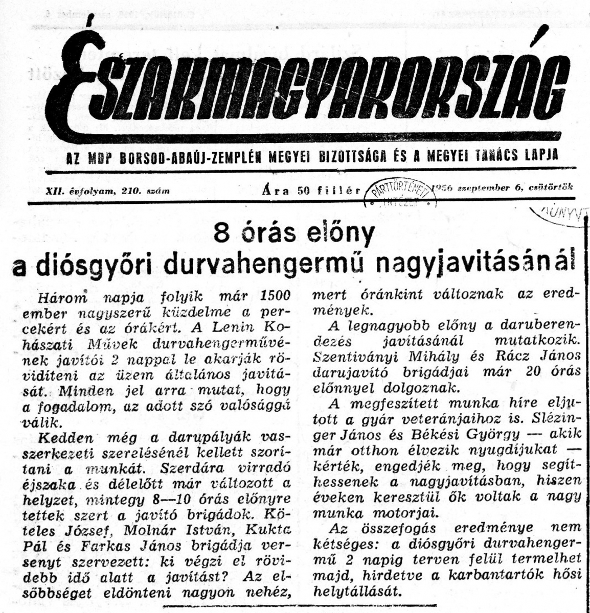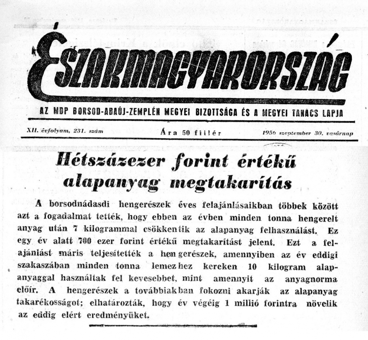 Vajon miről szóltak a hírek közvetlenül a forradalom előtt? Miről írt „az újság”, az Északmagyarország című napilap? Kiválasztottunk 56 hírt 1956-ról, minden napra egyet az október 23-ai forradalmat megelőző időkből – és mindig az adott napon tesszük közzé itt, honlapunkon. (Hétfőn nem jelent meg a lap, az akkori hétfőkre a vasárnapi lapból választottunk.) Kövessék velünk ennek a közel két hónapnak az eseményeit, olvassák velünk napról napra az 1956-os év 56 hírét!