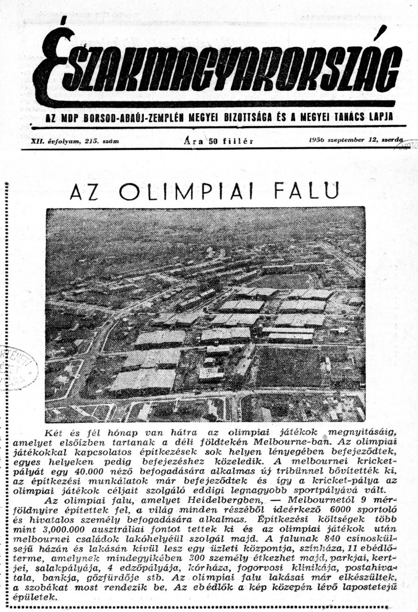 „Két és fél hónap van hátra az olimpiai játékok megnyitásáig, amelyet elsőízben tartanak a déli földtekén Melbourne-ban. (…) Az olimpiai falu, amelyet Heidelbergben, – Melbournetól 9 mérföldnyire építettek fel, a világ minden részéből ideérkező 6000 sportoló és hivatalos személy befogadására alkalmas.”