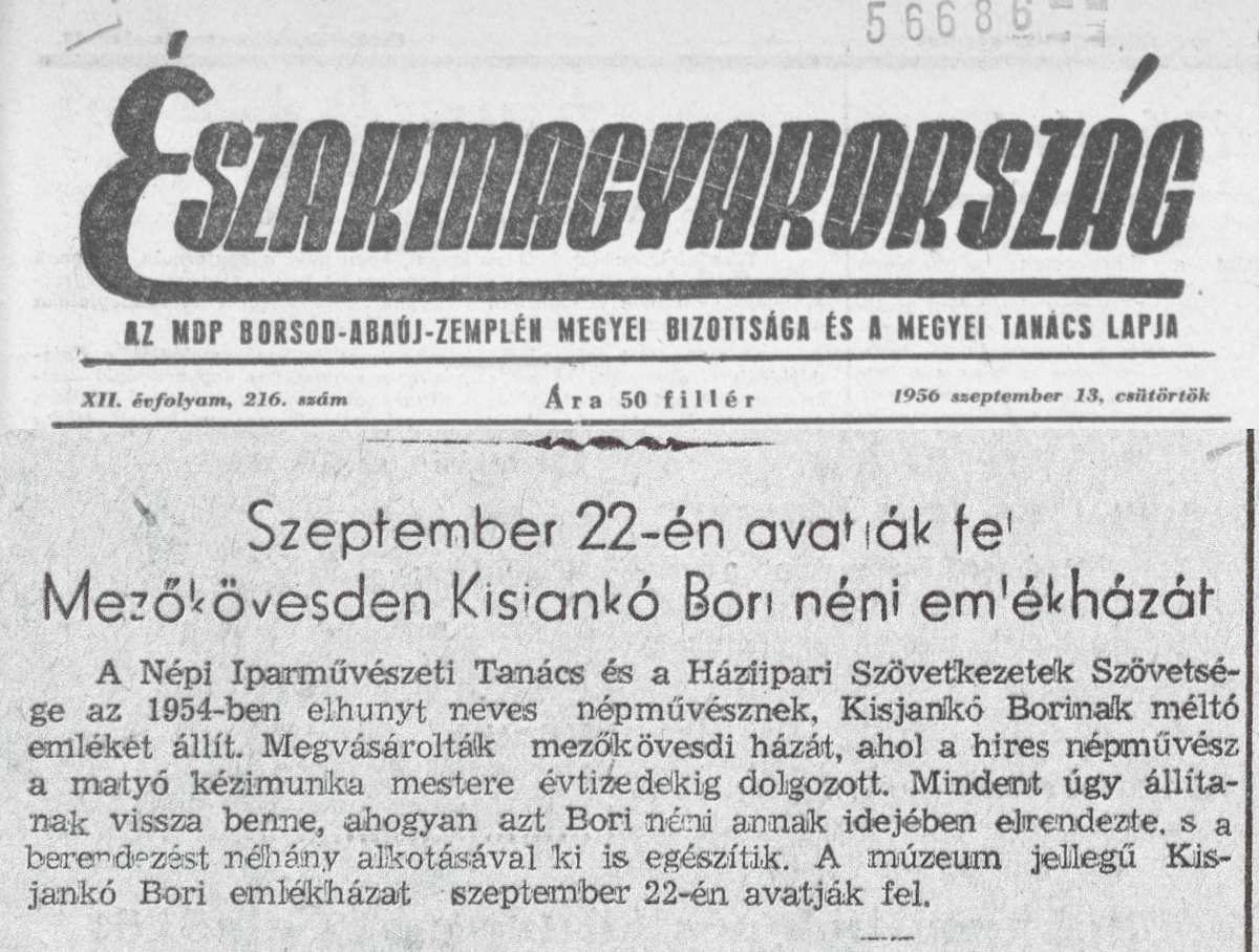 „Megvásárolták mezőkövesdi házát, ahol a híres népművész a matyó kézimunka mestere évtizedeik dolgozott. Mindent úgy állítanak vissza benne, ahogyan az Bori néni annak idején elrendezte, s a berendezést néhány alkotásával ki is egészítik.”