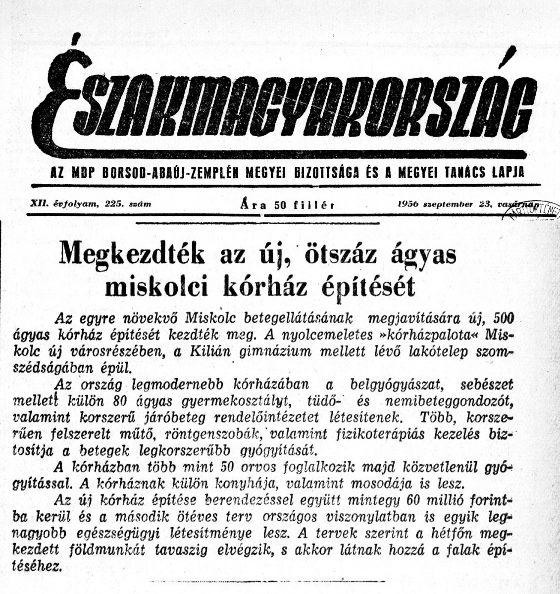 „A nyolcemeletes »kórházpalota« Miskolc új városrészében, a Kilián gimnázium mellett lévő lakótelep szomszédságában épül. (…) A tervek szerint a hétfőn megkezdett földmunkát tavaszig elvégzik, s akkor látnak hozzá a falak építéséhez.”