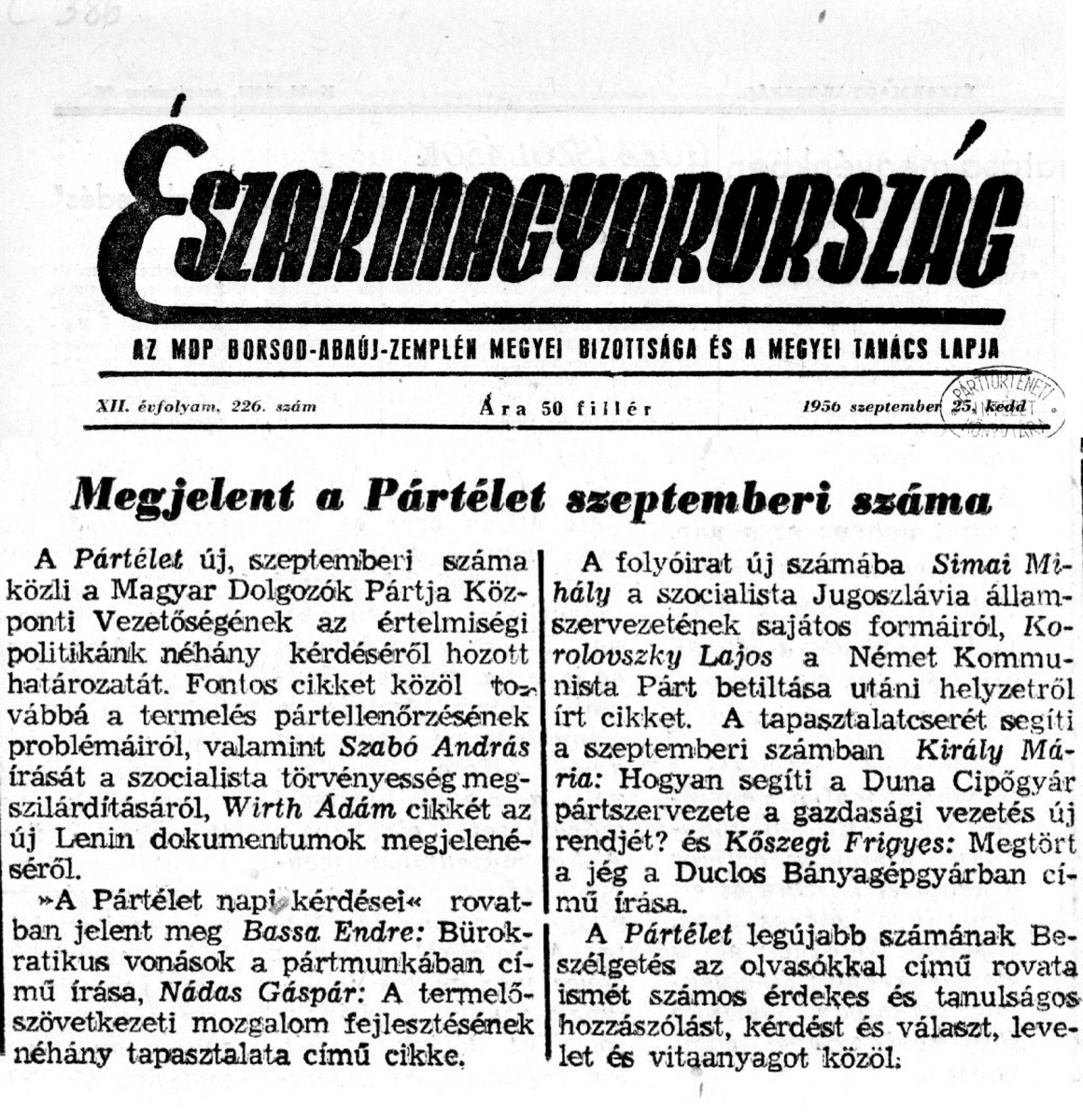 „A Pártélet új, szeptemberi száma közli a Magyar Dolgozók Pártja Központi Vezetőségének az értelmiségi politikánk néhány kérdéséről hozott határozatát. Fontos cikket közöl továbbá a termelés pártellenőrzésének problémáiról…”