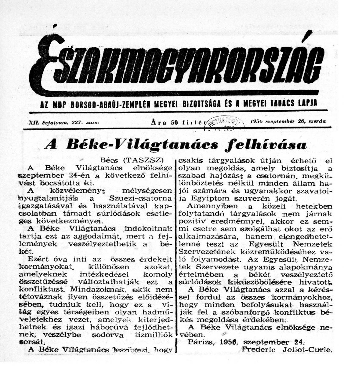 „A közvéleményt mélységesen nyugtalanítják a Szuezi-csatorna igazgatásával ás használatával kapcsolatban támadt súrlódások esetlegesek következményei. (…) A Béke Világtanács elnöksége nevében Frederic Joliot-Curie.”