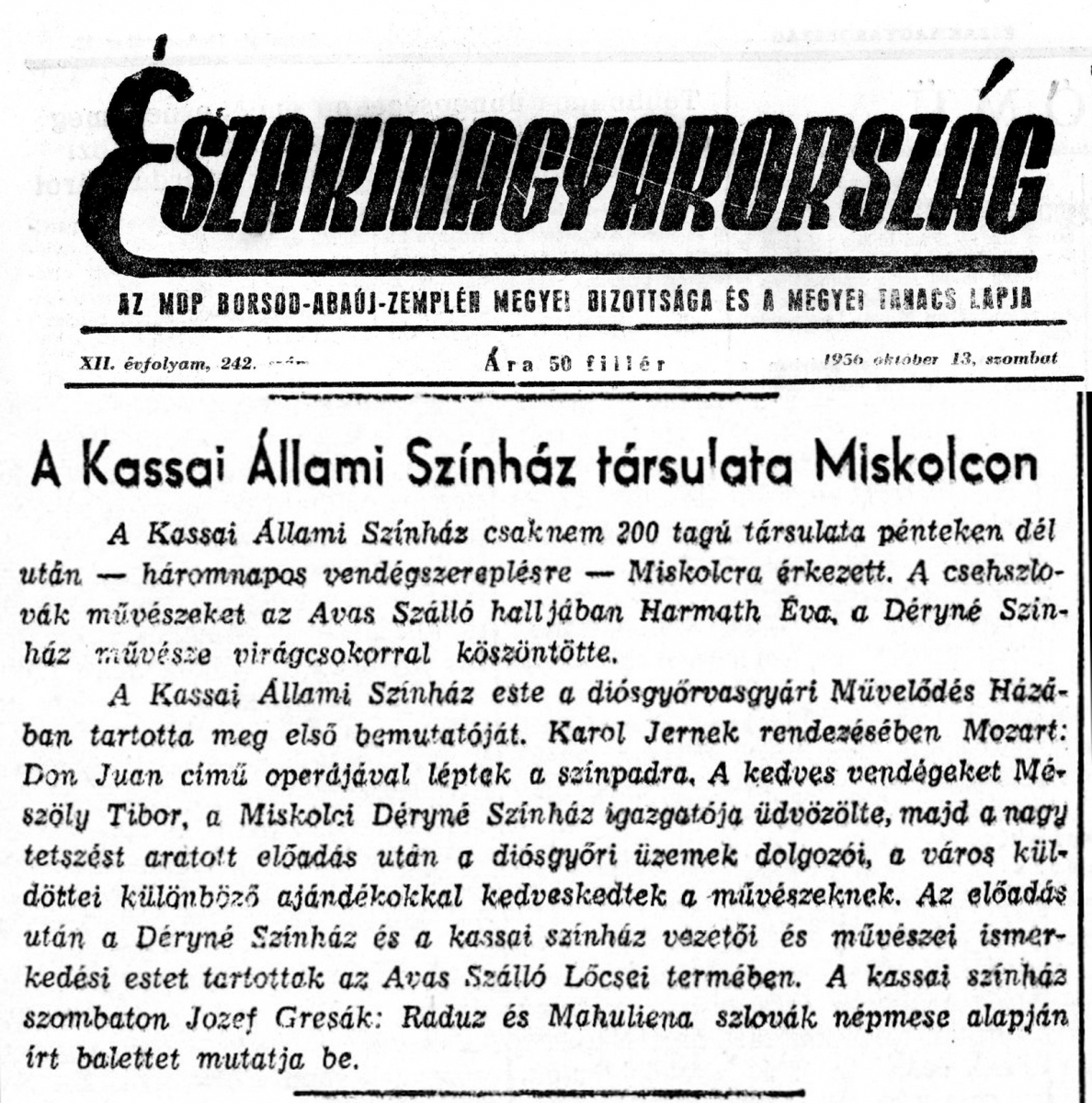 „A csehszlovák művészeket az Avas Szálló halljában Harmath Éva, a Déryné Színház művésze virágcsokorral köszöntötte. A Kassai Állami Színház este a diósgyőrvasgyári Művelődés Házában tartotta meg első bemutatóját.”