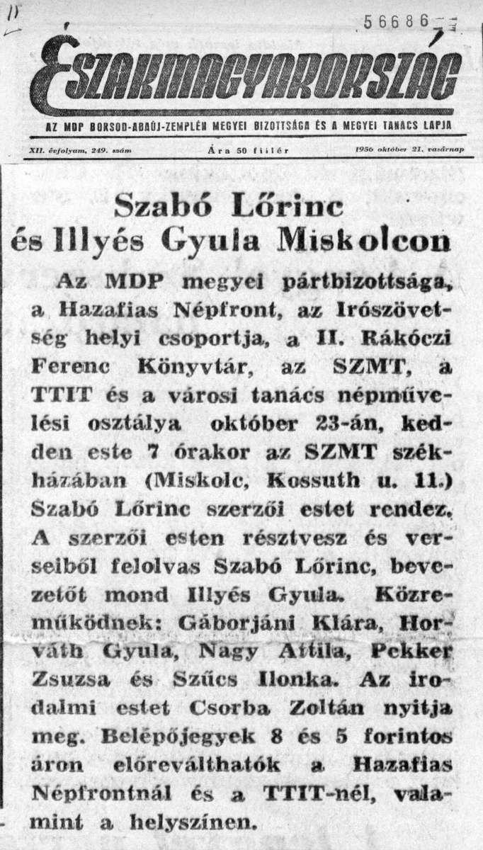 „… október 23-án, kedden este 7 órakor az SZMT székházában (Miskolc, Kossuth u. 11.) Szabó Lőrinc szerzői estet rendez. A szerzői esten résztvesz és verseiből felolvas Szabó Lőrinc, bevezetőt mond Illyés Gyula.”