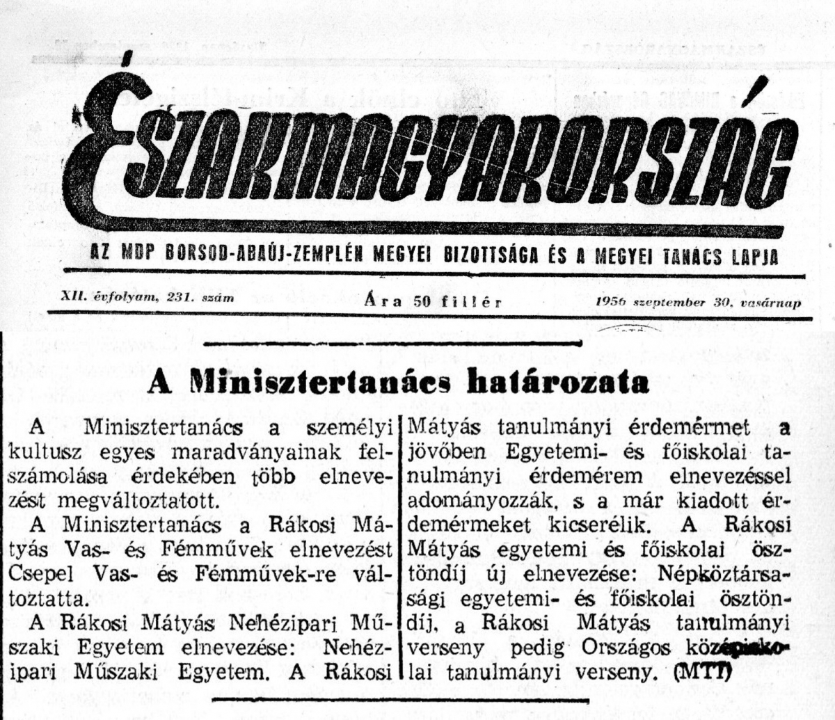 „A Minisztertanács a személyi kultusz maradványainak felszámolása érdekében több elnevezést megváltoztatott. A Minisztertanács a Rákosi Mátyás Vas- és Fémművek elnevezést Csepel Vas- és Fémművek-re változtatta. A Rákosi Mátyás Nehézipari Műszaki Egyetem elnevezése: Nehézipari Műszaki Egyetem.”