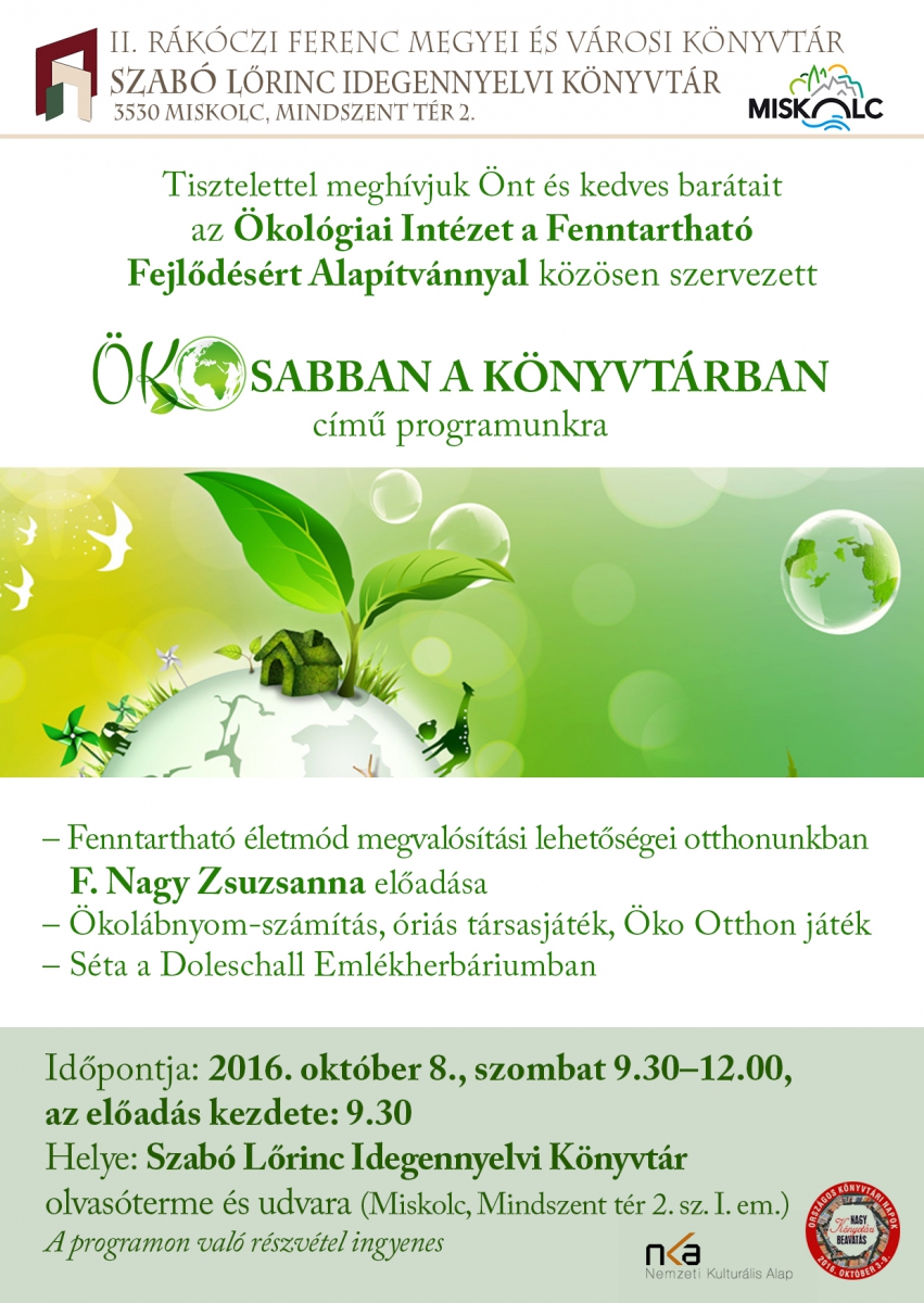 Október 8-án, szombaton délelőtt is kinyitja kapuit a Mindszent tér 2. szám alatti Szabó Lőrinc Könyvtár. Az Ökológiai Intézettel közös rendezvényen fél 10-től F. Nagy Zsuzsanna tart előadást arról, hogy otthonunkban hogyan valósítható meg a fenntartható életmód. Emellett ökolábnyom-számítással, óriás társasjátékkal, öko-otthon játékkal és emlékherbáriumi sétával várják a családokat – és mindenkit.