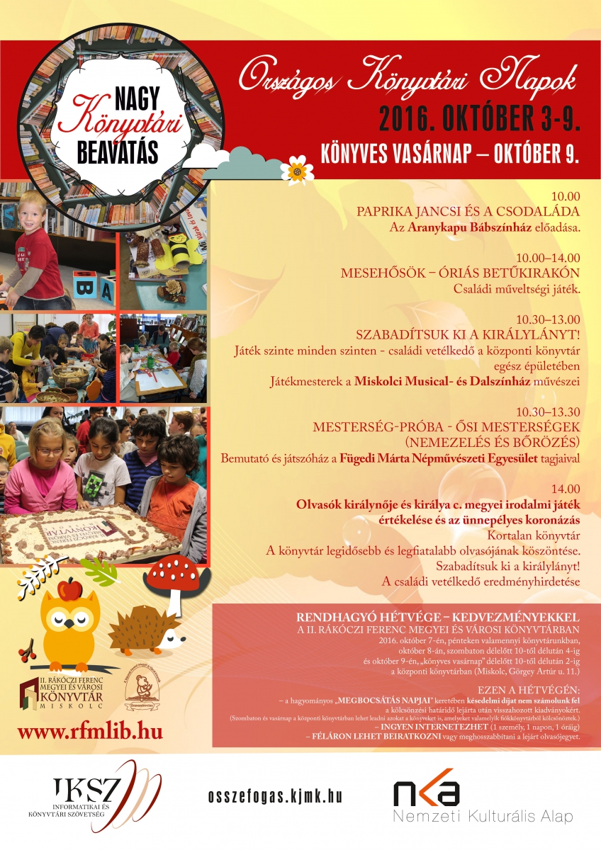 Október 9-én, vasárnap délelőtt 10 és délután 3 óra között sokféle játékkal várják a család apraját és nagyját a II. Rákóczi Ferenc Könyvtárban. Lesz bábszínház és kézműveskedés, ekkor köszöntik a könyvtár legidősebb és legfiatalabb olvasóját, kihirdetik és megkoronázzák az Olvasók királynőjét és királyát, azaz a megyei irodalmi játék legjobbjait. (A vetélkedő eredménye itt olvasható!)