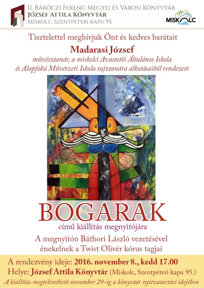 A bogarakról két dolgot biztosan tudunk. Az egyik, hogy minden bogár rovar (de nem minden rovar bogár). A másik, hogy – különösen a nők szerint – rettentően sok lábuk van! Madarasi József művésztanár viszont ennél jóval többet tud róluk, lát bennük. És ha megnézzük képeit a II. Rákóczi Ferenc Megyei és Városi Könyvtár József Attila Könyvtárában rendezett kiállításon, mi is másképp gondolunk majd rájuk.