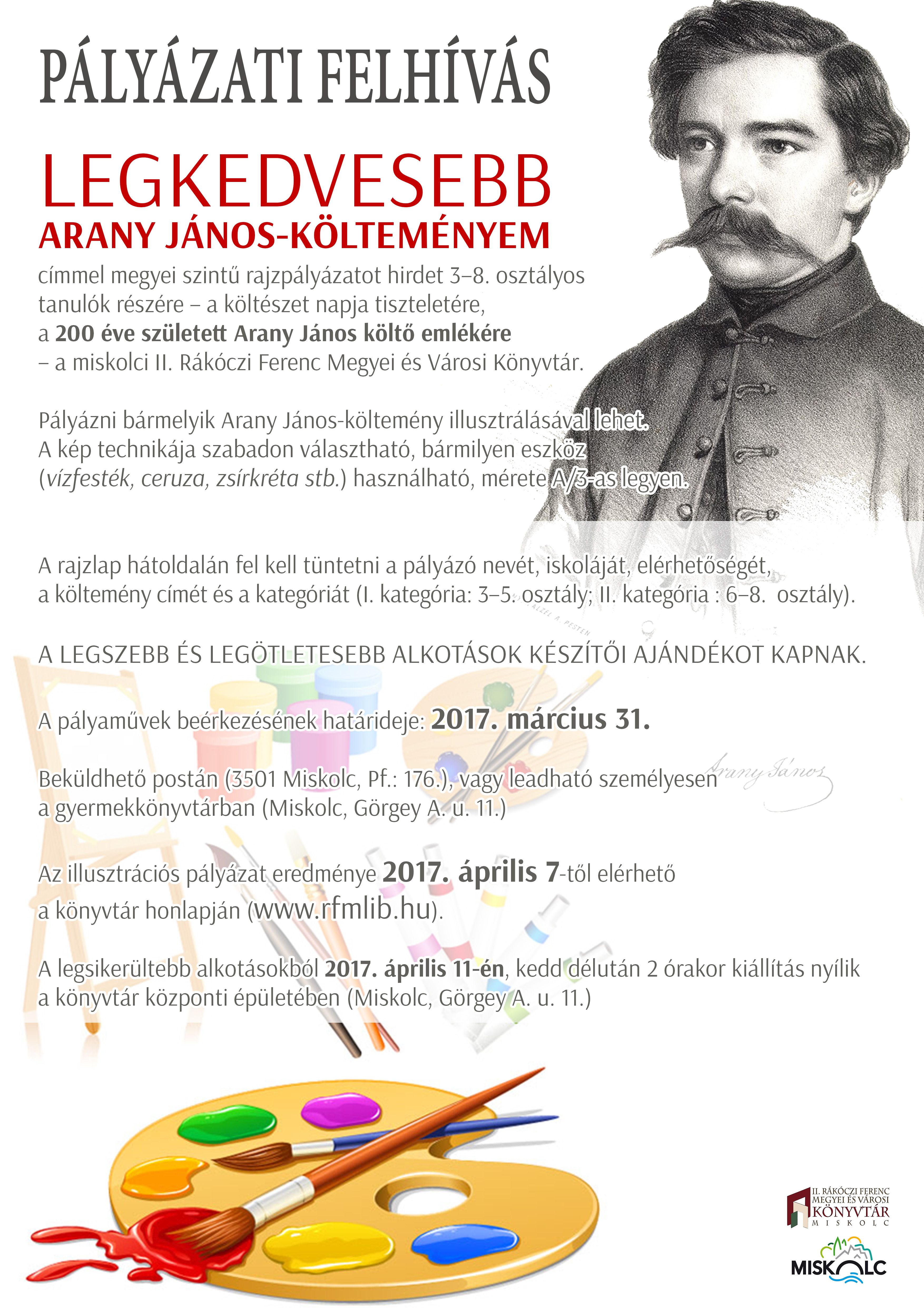 Legkedvesebb Arany János-költeményem címmel rajzpályázatot hirdet a Borsod-Abaúj-Zemplén megyében élő 3–8. osztályos tanulók részére – a költészet napja tiszteletére, a 200 éve született Arany János költő emlékére – a miskolci II. Rákóczi Ferenc Megyei és Városi Könyvtár.