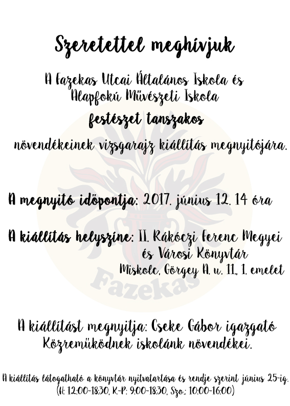 A miskolci Fazekas Utcai Általános Iskola és Alapfokú Művészeti Iskola festészet tanszakos növendékeinek alkotásaiból rendezett kiállítást Cseke Gábor igazgató nyitja meg június 12-én, hétfőn délután 2 órakor könyvtárunk központi épületében.