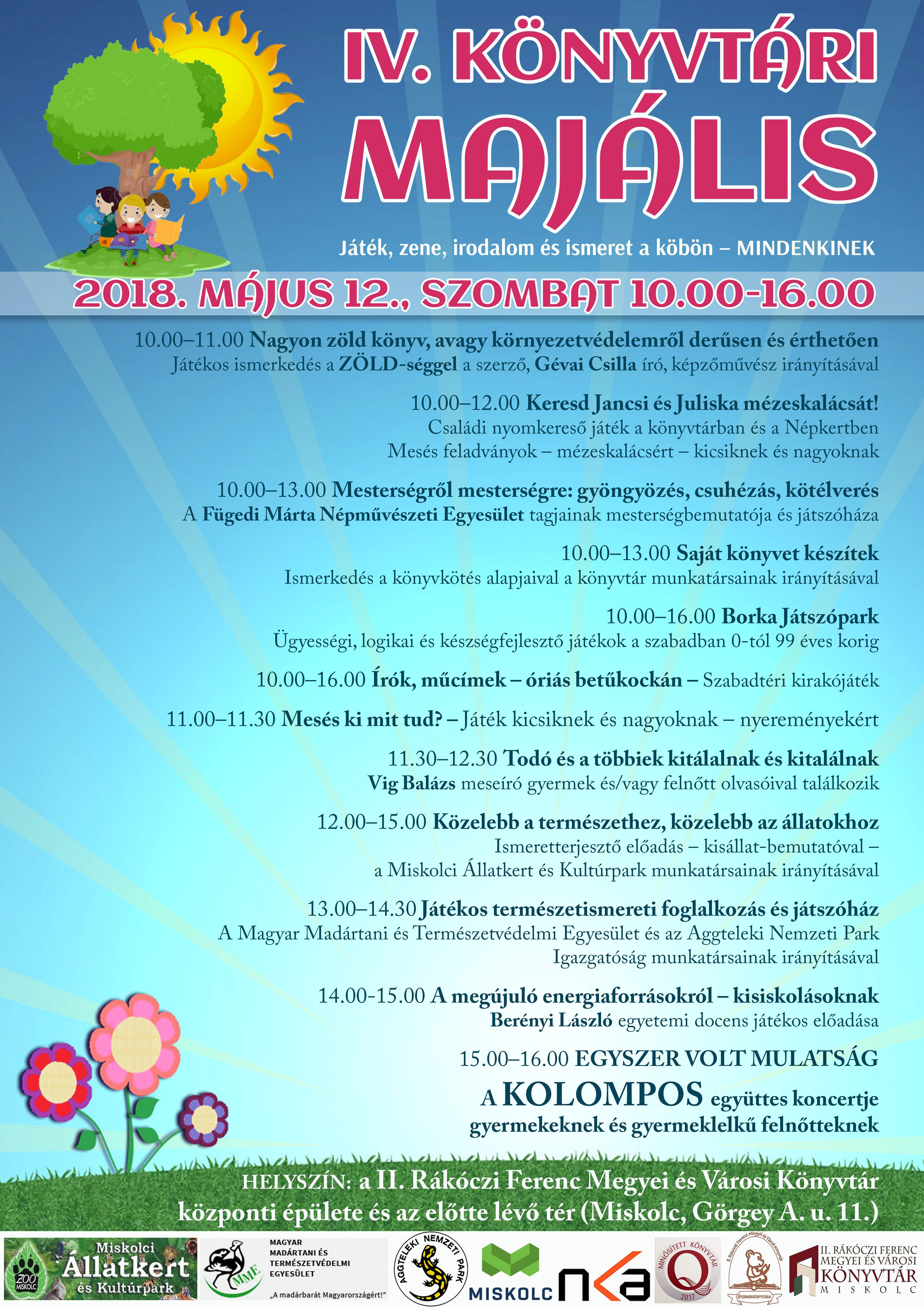 IV. Könyvtári majális, vagy ahogyan a gyermekkönyvtárosok ajánlják, a szabadtéri zöld könyv(társas) fesztivál minden korosztály számára tartogat – érdekes, hasznos, szórakoztató, de leginkább könyv(társas) – programokat. A május 12-én, szombaton délelőtt 10 órakor kezdődő majális keretében – a központi könyvtárban és az előtte lévő téren – lesz sok-sok játék, kézműves foglalkozás, mesterségbemutató, természetismereti foglalkozás, jön Vig Balázs író és a Kolompos együttes is.