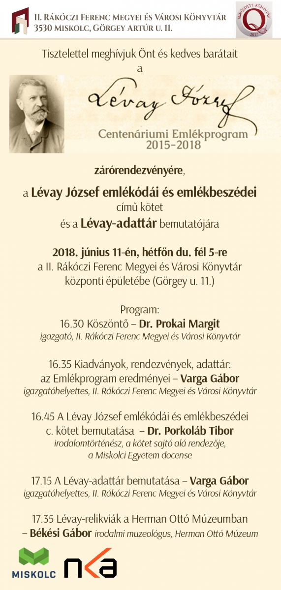 2015-ben négy miskolci intézmény fogott össze annak érdekében, hogy felmérjék és közzétegyék mindazt a miskolci közgyűjteményekben fellelhető anyagot, ami Lévay személyéhez és munkássághoz kötődik. 2018. június 11-én, hétfőn délután fél 5-től az emlékprogram záró rendezvényén a Miskolci Egyetem Magyar BTK Nyelv- és Irodalomtudományi Intézete, a II. Rákóczi Ferenc Megyei és Városi Könyvtár, a Herman Ottó Múzeum és a MNL Borsod-Abaúj-Zemplén Megyei Levéltára közös munkájuk eredményéről számolnak be: a megjelent monográfiáról és tudományos szövegkiadásról, az emlékprogram honlapján elérhető Lévay-adattárról és az elmúlt években megvalósult rendezvényekről.