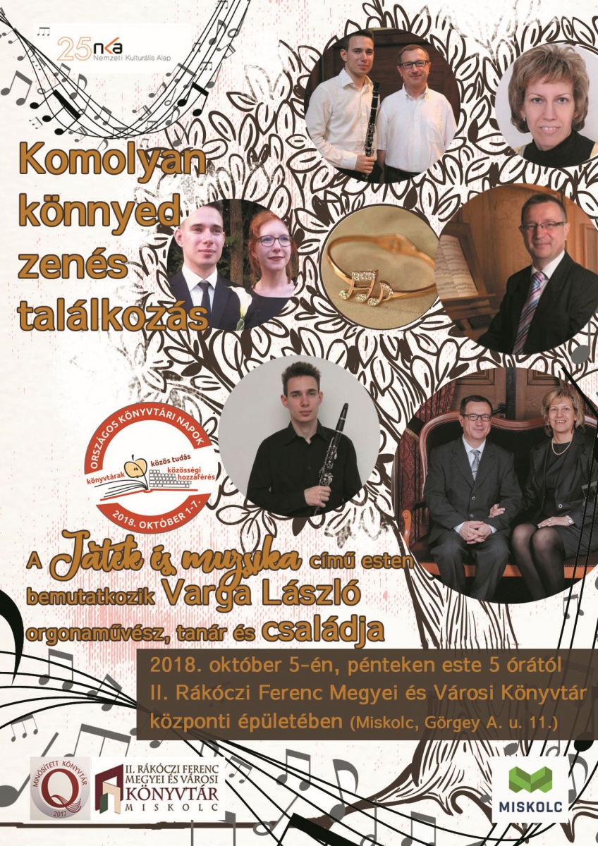 Varga László orgonaművész és családja mutatkozik be – az Országos Könyvtári Napok keretében – október 5-én, pénteken délután 5 órától a könyvtár központi épületében (Miskolc, Görgey A. u. 11.).