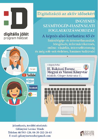 Digitalizáció az aktív idősekért címmel ingyenes számítógép-használati foglalkozássorozat indul 2019. január 14-től a II. Rákóczi Ferenc megyei és Városi Könyvtár központi épületében (Miskolc, Görgey A. u. 11.). A képzés alsó korhatára: 65 év. A programban szerepel számítógép- és internethasználat, böngészés, információkeresés, online-vásárlás, internetbiztonság és még sok-sok érdekes, hasznos tudnivaló.