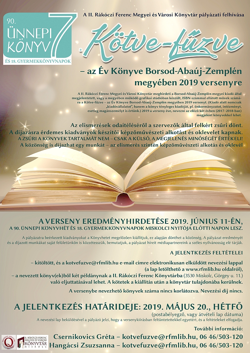 A 90. Ünnepi Könyvhét alkalmából a II. Rákóczi Ferenc Megyei és Városi Könyvtár meghirdeti a Borsod-Abaúj-Zemplén megyei kiadó által megjelentetett, vagy a megyében működő grafikai stúdióban készült, ISBN-számmal ellátott művek számára a Kötve-fűzve – az Év Könyve Borsod-Abaúj-Zemplén megyében 2019 versenyt.