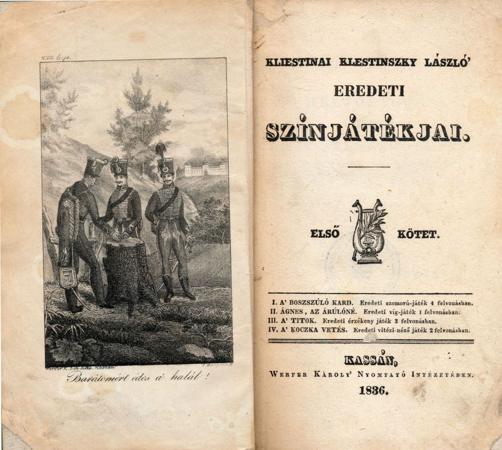 E havi könyvritkaságunk egy mára már elfelejtett „helyi szerző” – ügyvéd, bíró, színműíró és műfordító – 1836-ban Kassán Werfer Károly Nyomtató Intézetében megjelent műve: Kliestinai Klestinszky László' eredeti színjátékai című gyűjteményének első kötete. (A boszszúló kard, szomorú-játék 4 felv., Ágnes, az árúlóné, víg-játék 1 felv., A titok, érzékeny játék 3 felv., A koczka vetés, vitézi néző játék 2 felv., mind előadattak Kassán; utóbbi Rozgonyban 1833. febr. 13. műkedvelőktől is előadatott.) A második kötetre 1837-ben hirdetett előjegyzést, de pártolás hiányában, sajnos, nem jelent meg.