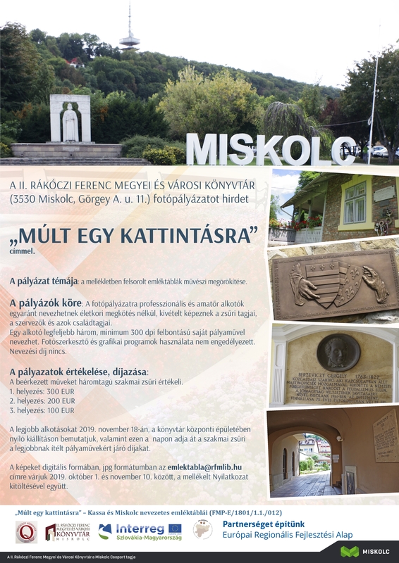 Múlt egy kattintásra  címmel fotópályázatot hirdet a II. Rákóczi Ferenc Megyei és Városi Könyvtár (3530 Miskolc, Görgey A. u. 11.) Múlt egy kattintásra” – Kassa és Miskolc nevezetes emléktáblái c. pályázata keretében (FMP-E/1801/1.1./012).