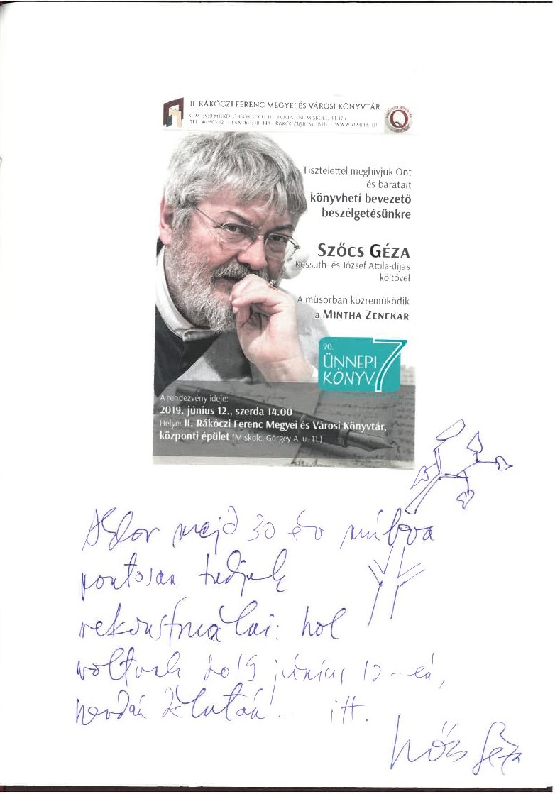 Szőcs Géza Kossuth- és József Attila-díjas költő mondott ünnepi beszédet a 90. Ünnepi könyvhét és a 18. Gyermekkönyvnapok országos – egyben miskolci és Borsod-Abaúj-Zemplén megyei – megnyitóján 2019. június 12-én Miskolcon az Erzsébet téren. Ezt követően a II. Rákóczi Ferenc Megyei és Városi Könyvtár központi épületében találkozott olvasóival a költő, ekkor készítette a következő felvételt Dobos Klára.  ITT érhető el.