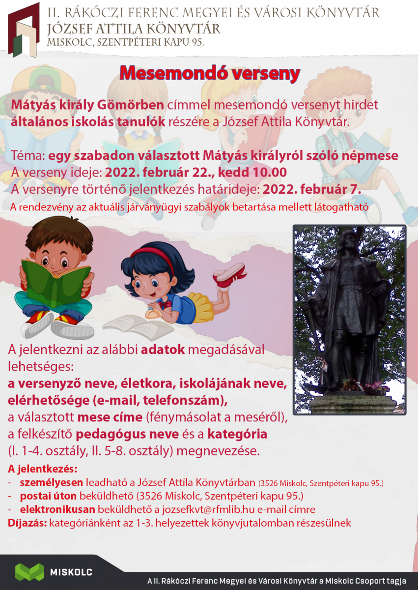 Mátyás király Gömörben címmel hirdet mesemondó versenyt általános iskolai tanulók számára a József Attila Könyvtár (Miskolc, Szentpéteri kapu 95.). A jelentkezési határidő 2022. február 7. A Hunyadi Mátyásról szóló, szabadon választott meséket, mondákat február 22-én kell a a zsűri előtt elmondaniuk a versenyzőknek.