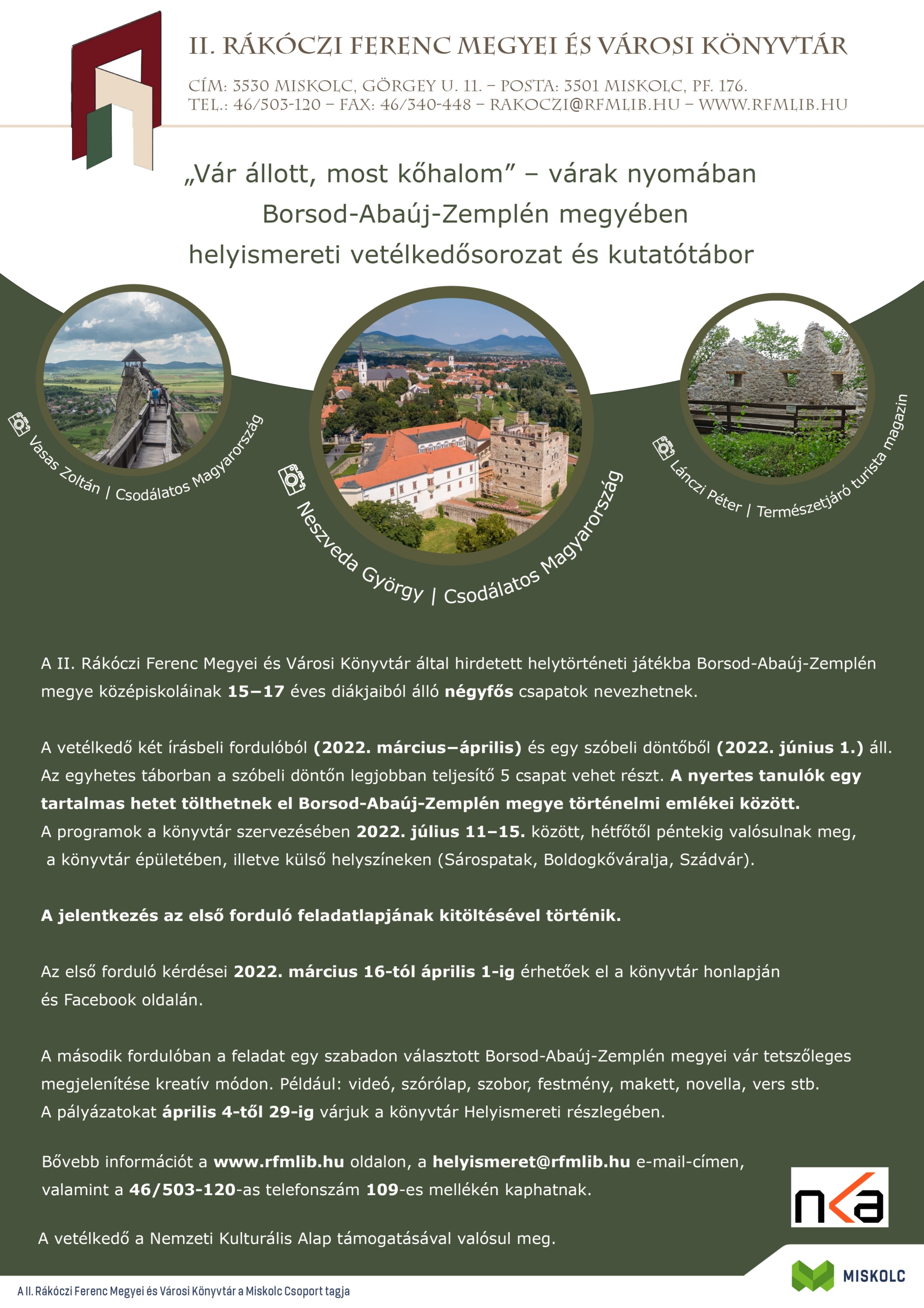 A „Vár állott, most kőhalom” – várak nyomában Borsod-Abaúj-Zemplén megyében című helytörténeti játékba Borsod-Abaúj-Zemplén megye középiskoláinak diákjaiból álló négyfős csapatok nevezhetnek.
