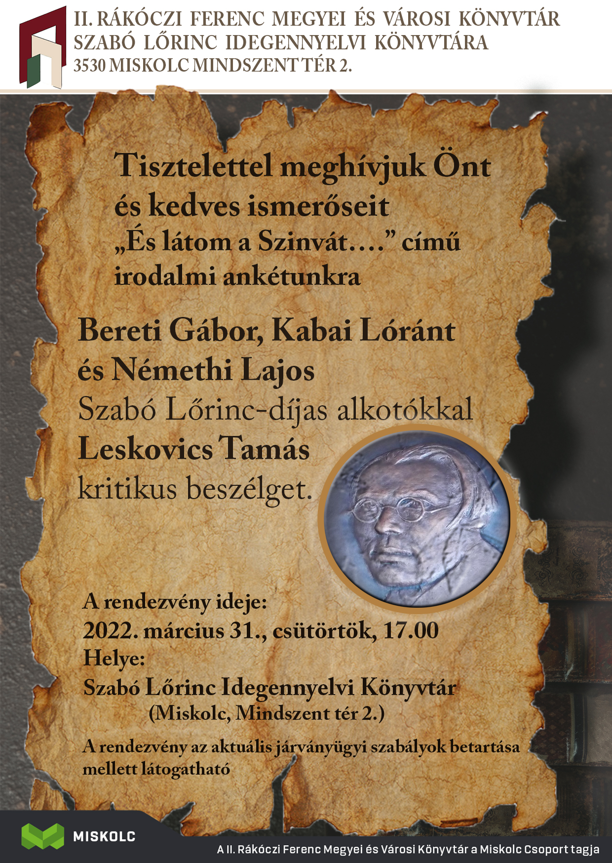 2022. március 31-én, csüt9rtökön délután 2 órakor koszorúzással kezdődik az ünnepség. A könyvtár udvarán található Szabó Lőrinc-szobornál a Miskolci Szabó Lőrinc Általános Iskola, valamint a Miskolci Symphonia Alapfokú Művészeti Iskola növendékei szerepelnek. A program délután 5 órakor pódiumbeszélgetéssel folytatódik. A hagyományok szerint a meghívott vendég ilyenkor a város előző évi Szabó Lőrinc-díjas szerzője. Az elmúlt két évben a pandémia miatt elmaradt ez a köszöntés, így most a korábbi évek kitüntetettjeivel, Bereti Gáborral, Kabai Lóránttal és Némethi Lajossal beszélget Leskovics Tamás kritikus.