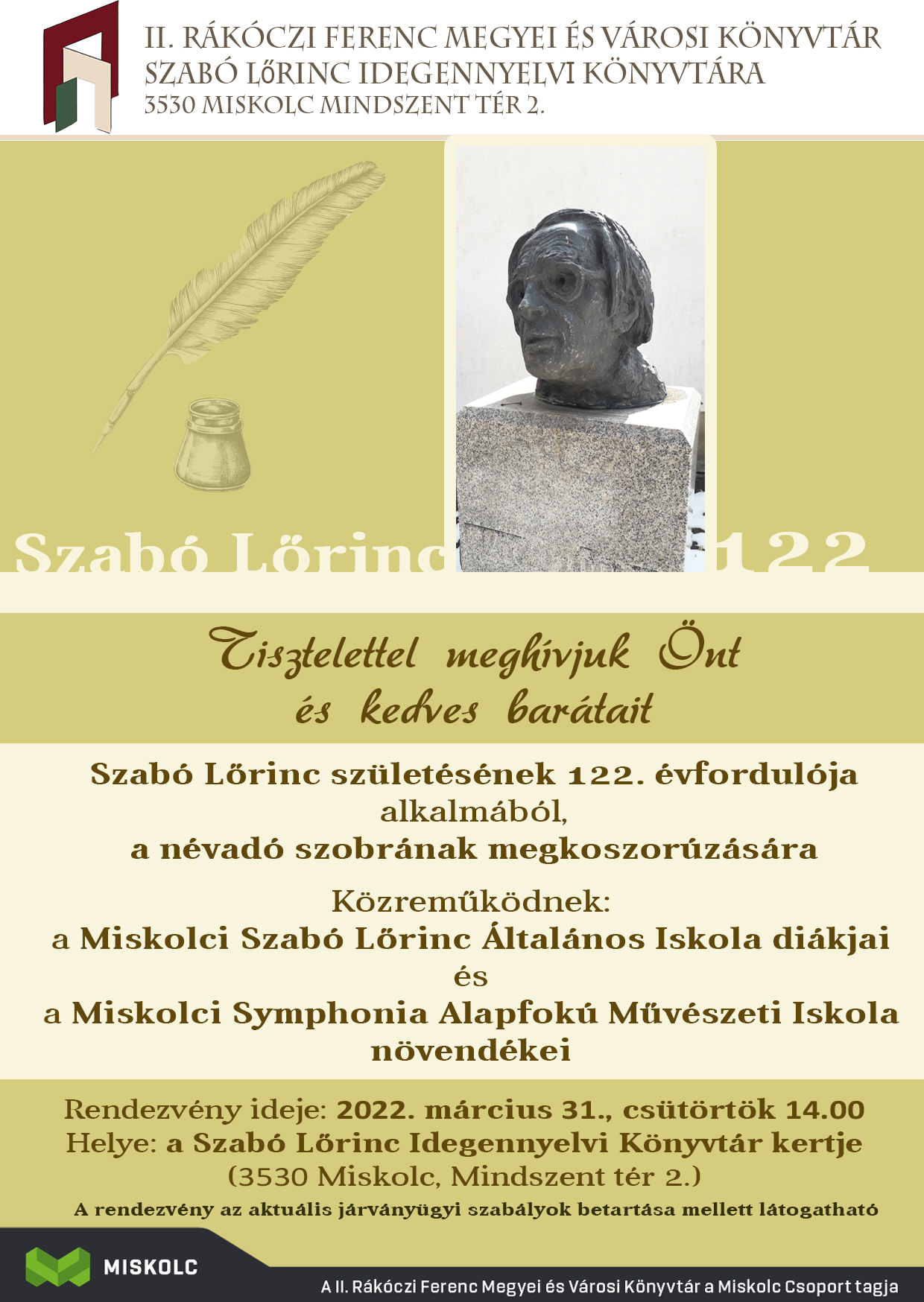 A Szabó Lőrinc Idegennyelvi Könyvtár (Miskolc, Mindszent tér 2.) koszorúzással és pódiumbeszélgetéssel tiszteleg névadója emléke előtt a költő születésének 122. évfordulóján.