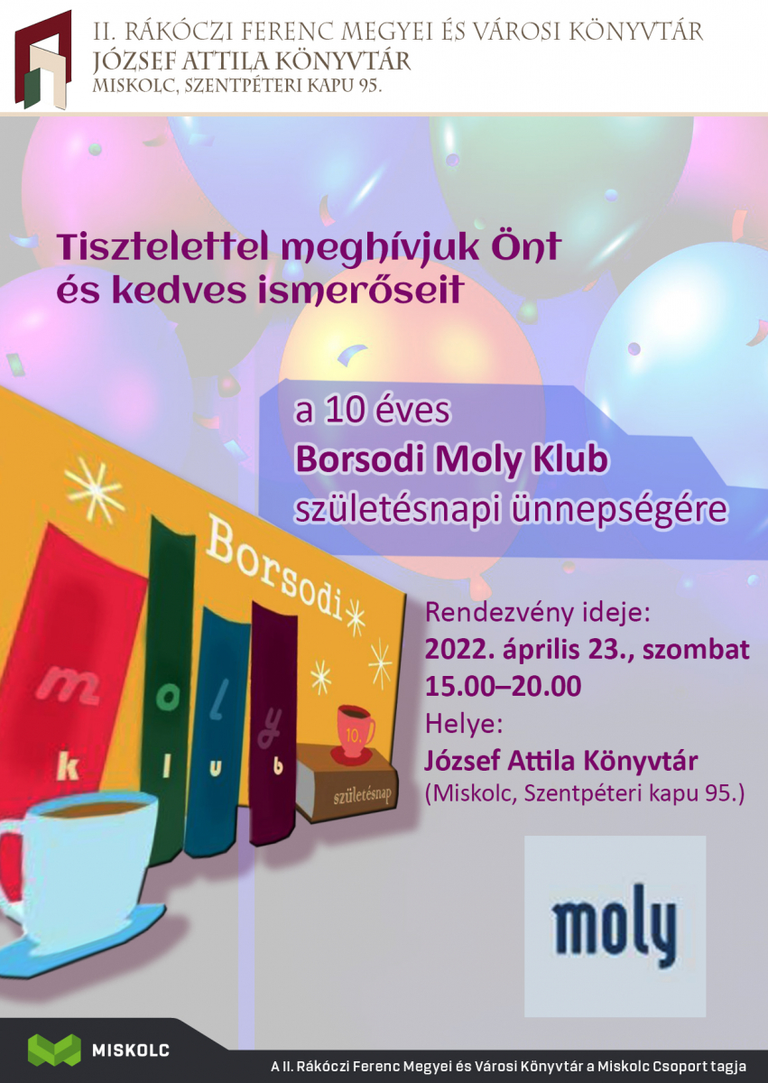 A Borsodi Moly Klub 2012 tavaszán alakult egy maroknyi lelkes könyv- és olvasáskedvelőből, akik valamennyien tagjai a moly.hu könyves közösségi oldalnak. A társaság ebben a hónapban 10 éves születésnapjára készül, melyet a József Attila Könyvtárban (Miskolc, Szentpéteri kapu 95.) tartanak 2022. április 23-án, szombaton délután 3 órától.