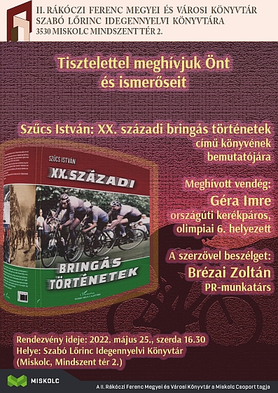 A könyv minden bizonnyal népszerű lesz a sportbarátok körében, hiszen a hazai kerékpárosok legismertebb alakjait mutatja be. A sportág nemzetközi legendája, a Tour de France és a Giro d’ Italia ötszörös, a Vuelta Espana győztese, a világbajnok belga Eddy Merckx köszönti az olvasókat, ajánlja nekik a kiadványt. Az interjúk, visszaemlékezések mellett korabeli fotók teszik színessé a kötetet, mely a L’ Harmattan Kiadó, valamint a Salkaházi Sára Miskolc Program Alapítvány gondozásában jelent meg. Izgalmas sztorikat, felejthetetlen élményeket olvashatunk Szűcs István tollából, aki korábbi kerékpárosként szakértői szemmel írja meg olykor személyes emlékeit, kérdezi szűkebb pátriája Miskolc, valamint hazánk kerékpáros életének kiemelkedő alakjait. A szerző az elhunyt bringásokról sem feledkezik meg, hiszen az ő eredményeiket is bemutatja. 2022. május 25-én, szerdán fél öttől a Szabó Lőrinc Idegennyelvi Könyvtárban (Miskolc, Mindszent tér 2.) a szerzővel, valamint a miskolci kerékpározás olimpiai 6. helyezettjével, Géra Imrével Brézai Zoltán a könyvtár PR-munkatársa beszélget.