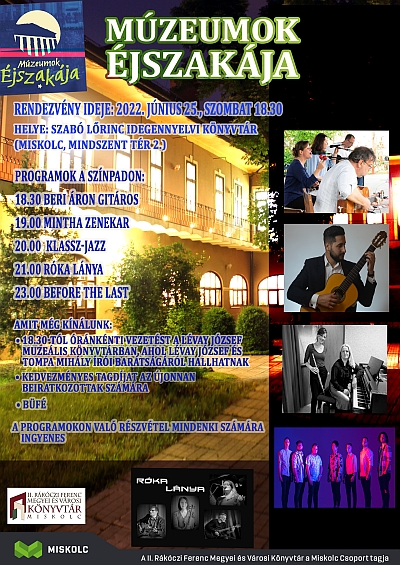 A Szabó Lőrinc Idegennyelvi Könyvtár (3530 Miskolc, Mindszent tér 2.) 2022. június 25-én, a Szent Iván-naphoz legközelebbi szombaton kapcsolódik a Múzeumok Éjszakája programjához. A hagyományos rendezvényen ezúttal is színes produkciók várják az érdeklődőket.