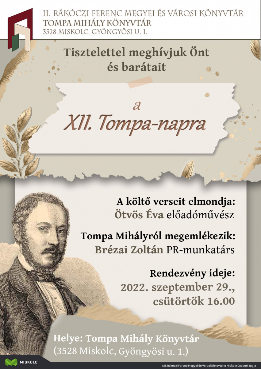 A hagyományoknak megfelelően 2022. szeptember 29-én, csütörtökön 16 órától tartanak megemlékezést Tompa Mihályról, a költőről elnevezett könyvtárban (3528 Miskolc, Gyöngyösi u. 1.).