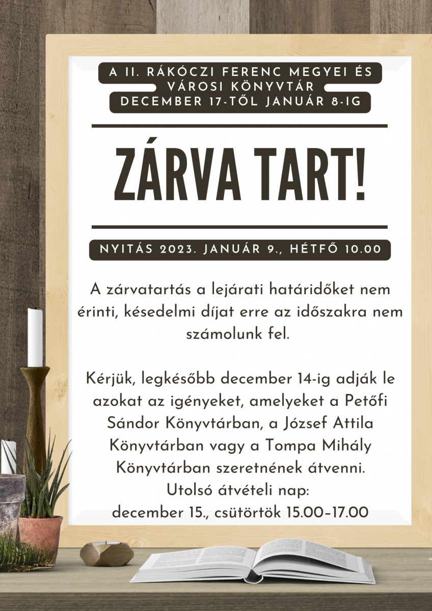 Kérjük, legkésőbb december 14-ig adják le azokat az igényeket, amelyeket a Petőfi Sándor Könyvtárban, a József Attila Könyvtárban vagy a Tompa Mihály Könyvtárban szeretnének átvenni.