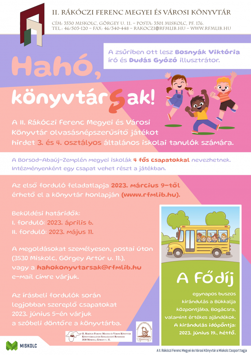 A megoldásokat személyesen, postai úton (3530 Miskolc, Görgey Artúr u. 11.), vagy a hahokonyvtarsak@rfmlib.hu e-mail-címre várjuk.