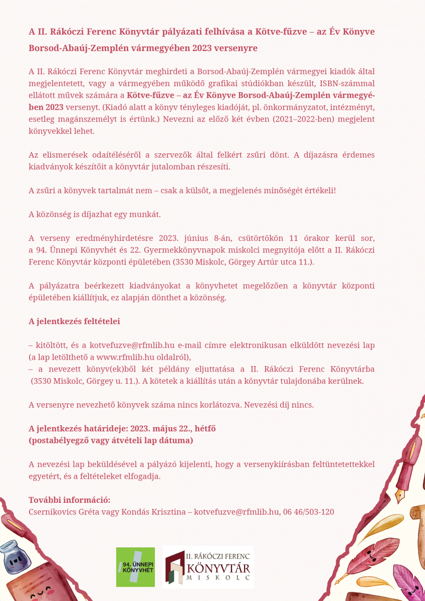 A Kötve-fűzve – az Év Könyve Borsod-Abaúj-Zemplén vármegyében 2023 versenyre az előző két évben (2021-ben és 2022-ben) megjelent kötetekkel lehet nevezni 2023. május 22-ig. Az úgynevezett „kiadóvállalatok”, mellett önkormányzatok, intézmények és magánszemélyek kiadásában megjelent köteteket is jelentkezésüket is várja. A versenyre nevezhető könyvek száma nincs korlátozva, és nevezési díjat sem kell fizetni. A versenyre a kitöltött, és a kotvefuzve@rfmlib.hu e-mail-címre elküldött nevezési lappal lehet jelentkezni, a kiválasztott könyv, vagy könyvek két példányát a II. Rákóczi Ferenc Könyvtárba (3530 Miskolc, Görgey A. u. 11.) kell eljuttatni. A nevezési lapot innen töltheti le.