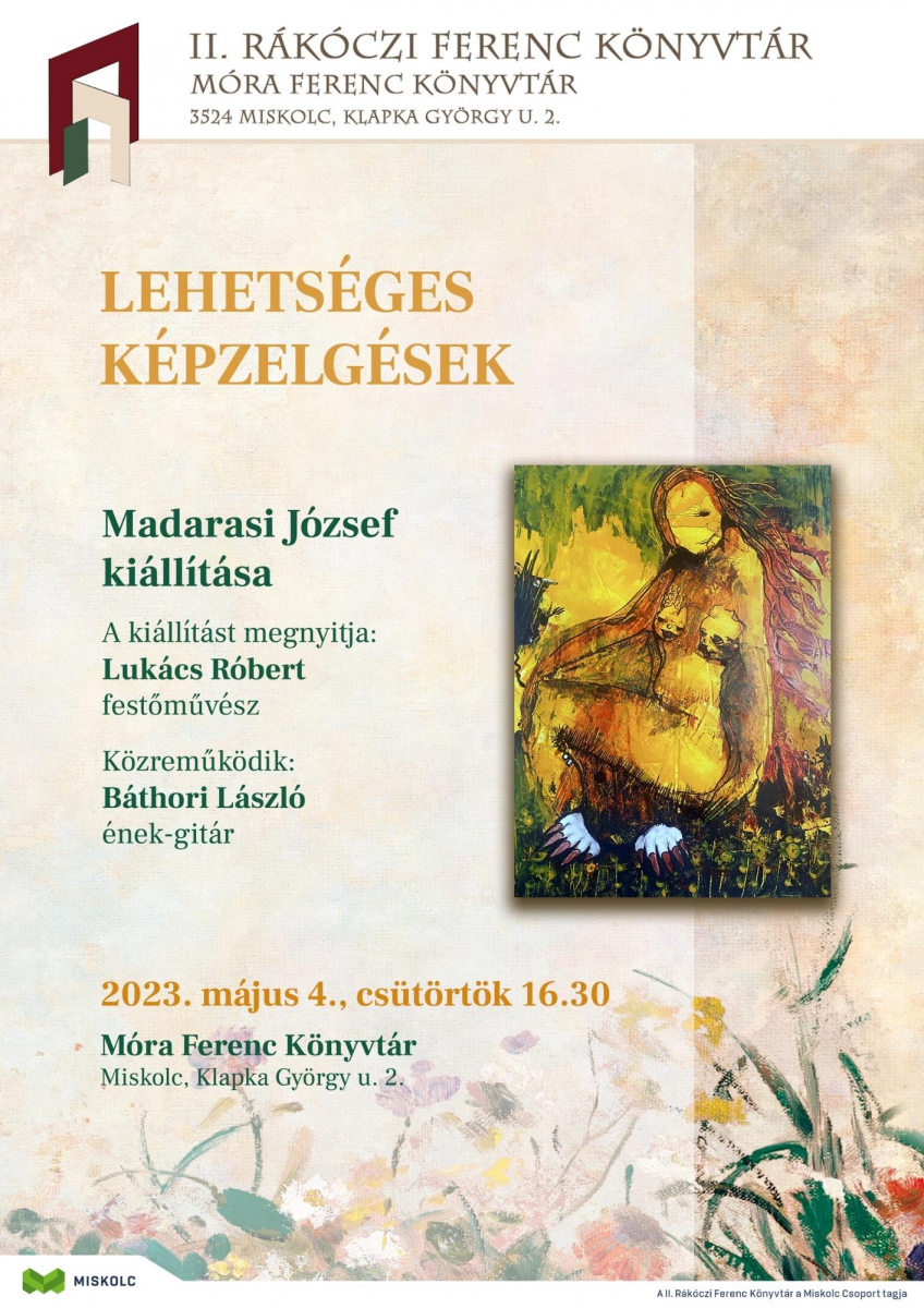 Lehetséges képzelgések címmel nyílik kiállítás 2023. május 4-én, csütörtökön délután fél öttől a Móra Ferenc Könyvtárban (Miskolc Klapka György u. 2.). A Madarasi József alkotásaiból összeállított tárlatot Lukács Róbert festőművész nyitja meg. A tárlat 2023. június 30-ig látható.