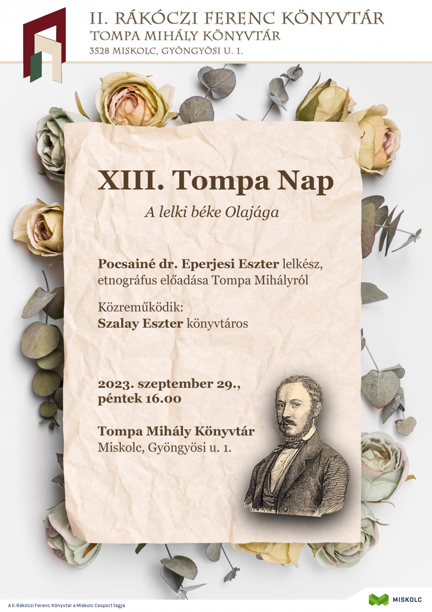 A hagyományoknak megfelelően 2023. szeptember 29-én, pénteken 16 órától megemlékezést tartanak Tompa Mihályról, a költőről elnevezett könyvtárban (3528 Miskolc, Gyöngyösi u. 1.).