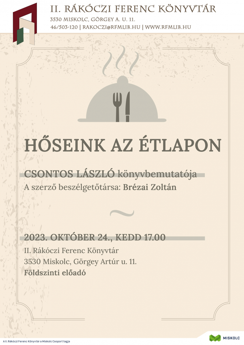 A Hőseink az étlapon című kötet bemutatóját 2023. október 24-én, kedden 17 órától tartják a II. Rákóczi Ferenc Könyvtár központi épületében (Miskolc, Görgey A. u. 11.).