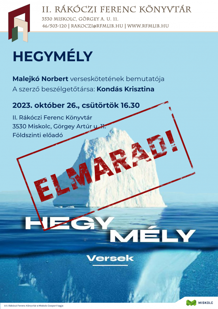 A II. Rákóczi Ferenc Könyvtár téjékoztatja olvasóit, hogy Malejkó Norbert: Hegymély című verseskötetének 2023. október 26-án 16.30-ra tervezett bemutatója elmarad. Szíves megértésüket köszönjük.