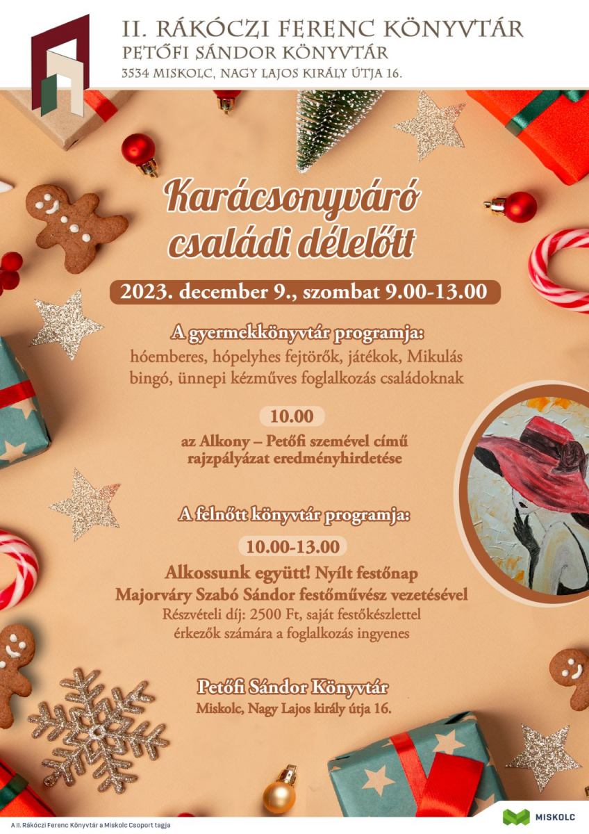 A karácsony közeledtével színes programmal várja olvasóit a 2023. december 9-én, szombaton délelőtt 10 órától Petőfi Sándor Könyvtár (Miskolc, Nagy Lajos király útja 16.). A rendezvényen minden érdeklődő megtalálja a számára oly kedves programelemet.