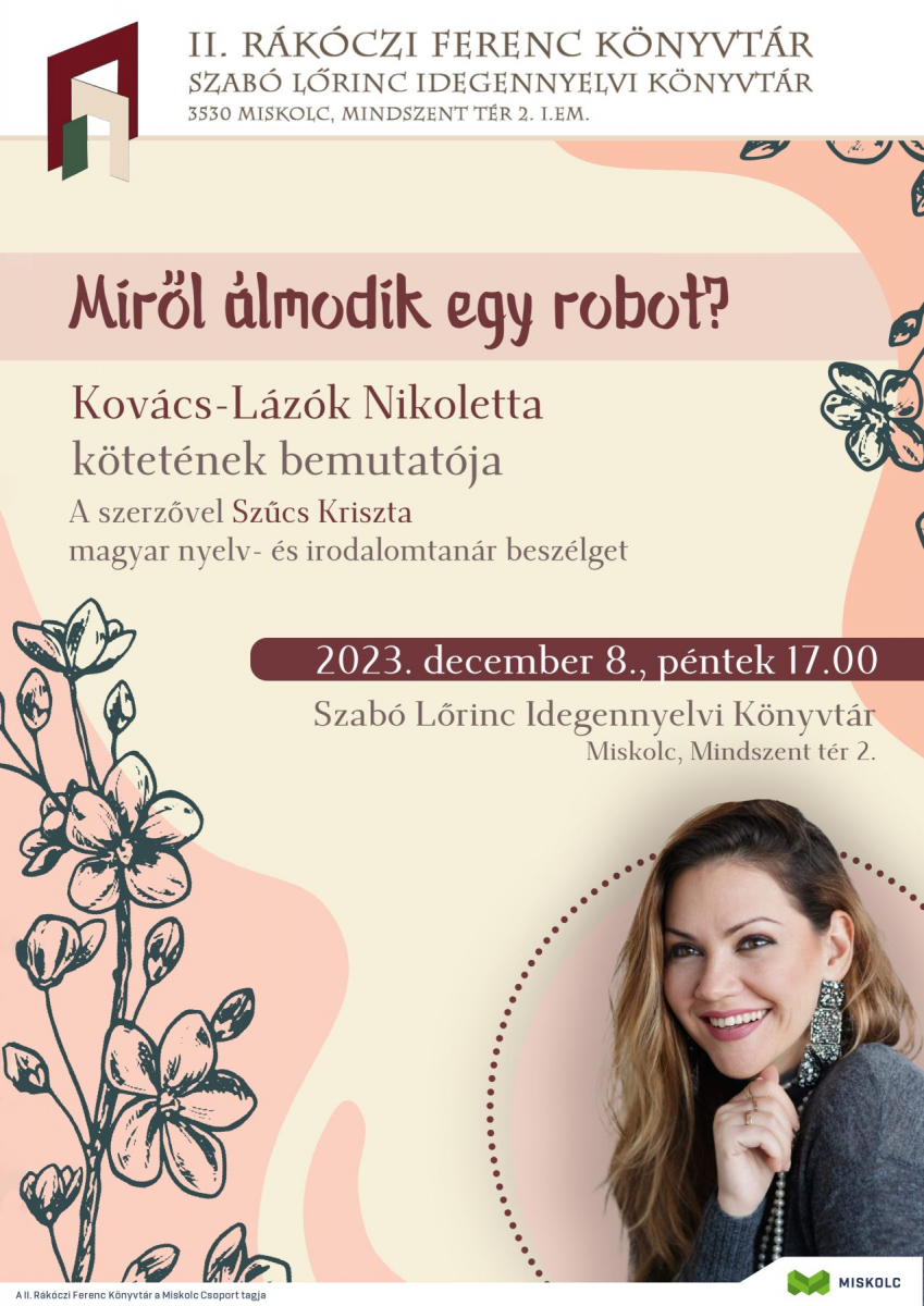 Kovács-Lázók Nikoletta Miről álmodik egy robot? című kötetének bemutatóját tartják 2023. december 8-án, pénteken 17 órától a Szabó Lőrinc Idegennyelvi Könyvtárban (Miskolc, Mindszent tér 2.). A szerzővel Szűcs Kriszta magyar nyelv- és irodalomtanár beszélget.