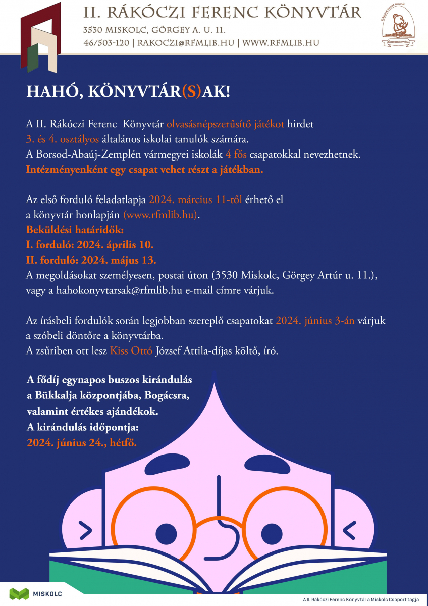 A megoldásokat személyesen, postai úton (3530 Miskolc, Görgey Artúr u. 11.), vagy a hahokonyvtarsak@rfmlib.hu e-mail címre várjuk.
