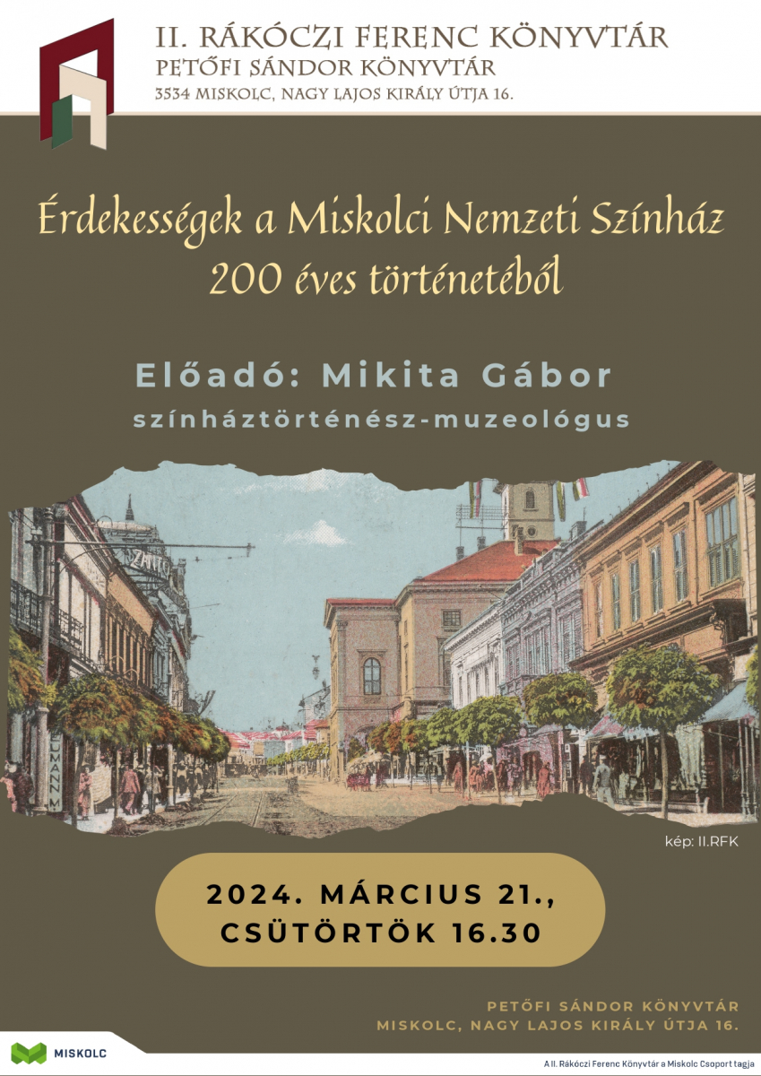 Érdekességek a Miskolci Nemzeti Színház 200 éves történetéből címmel tart ismeretterjesztő előadást 2024. március 21-én, csütörtökön 16.30-tól Mikita Gábor színháztörténész-muzeológus a Petőfi Sándor Könyvtárban (Miskolc, Nagy Lajos király útja 16.).