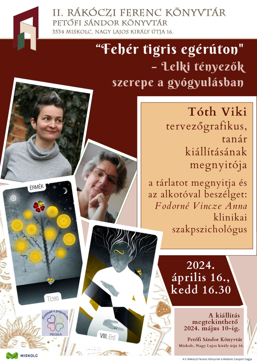 Fehér tigris egérúton – Lelki tényezők szerepe a gyógyulásban címmel nyílik Tóth Viki tervezőgrafikus, tanár kiállításaa 2024. április 16-án, kedd 16.30-kor a Petőfi Sándor Könyvtárban