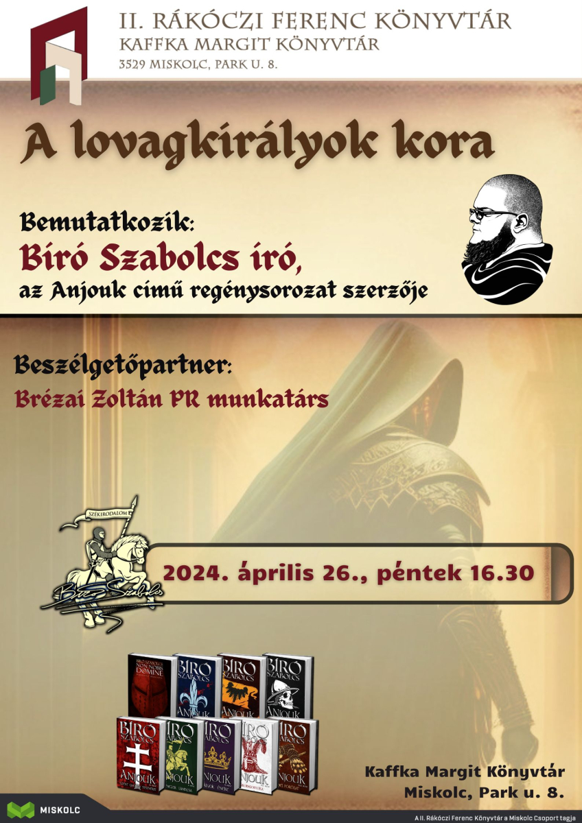 A történelmi regényeket kedvelő olvasóinknak is ajánljuk rendezvényünket. Bíró Szabolcs íróval, az Anjouk című regénysorozat szerzőjével ezúttal A lovagkirályok kora című regényéről beszélget Brézai Zoltán PR-munkatárs 2024. április 26-án, pénteken 16.30-kor a Kaffka Margit Könyvtárban (3529 Miskolc, Park u. 8.). Szeretettel várjuk az érdeklődőket erre a különlegesnek ígérkező beszélgetésre, hogy ismerjük meg a magyar történelem egyik fontos korszakát egy kicsit közelebből.