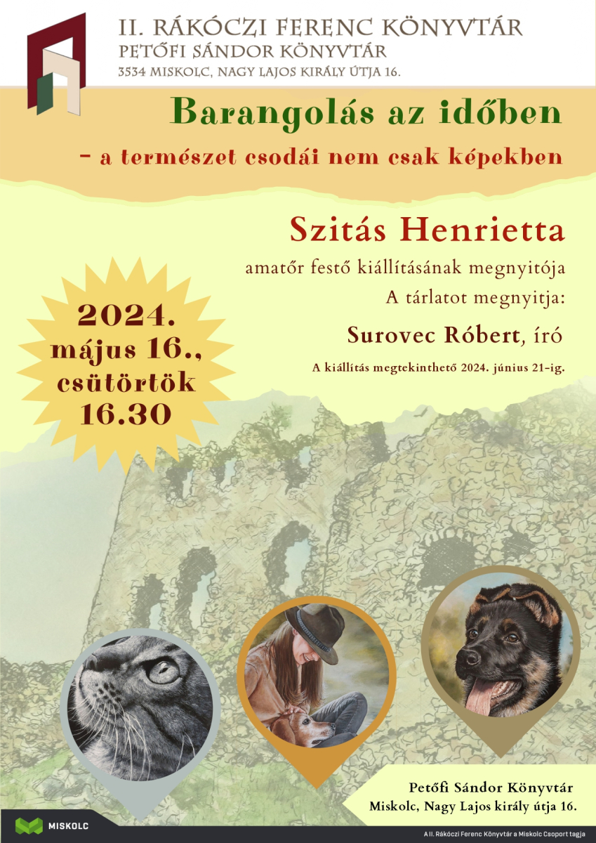 Barangolás az időben – a természet csodái nem csak képekben címmel nyílik kiállítása Szitás Henrietta amatőr festőnek 2024. május 16-án, csütörtökön a Petőfi Sándor Könyvtárban (Miskolc, Nagy Lajos király útja 16.). A tárlat 2024. június 21-ig tekinthető meg.
