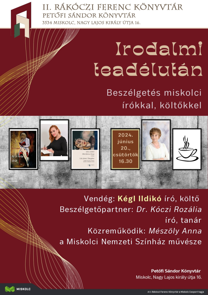 Folytatódik az Irodalmi teadélután a Petőfi Sándor Könyvtárban (Miskolc, Nagy Lajos király útja 16.). A sorozat következő vendége 2024. június 20-án, csütörtökön 16.30-tól Kégl Ildikó író, költő lesz, akivel a program ötletgazdája dr. Kóczi Rozália író, tanár beszélget. A rendezvényen Mészöly Anna a Miskolci Nemzeti Színház művésze olvas fel a szerző írásaiból.
